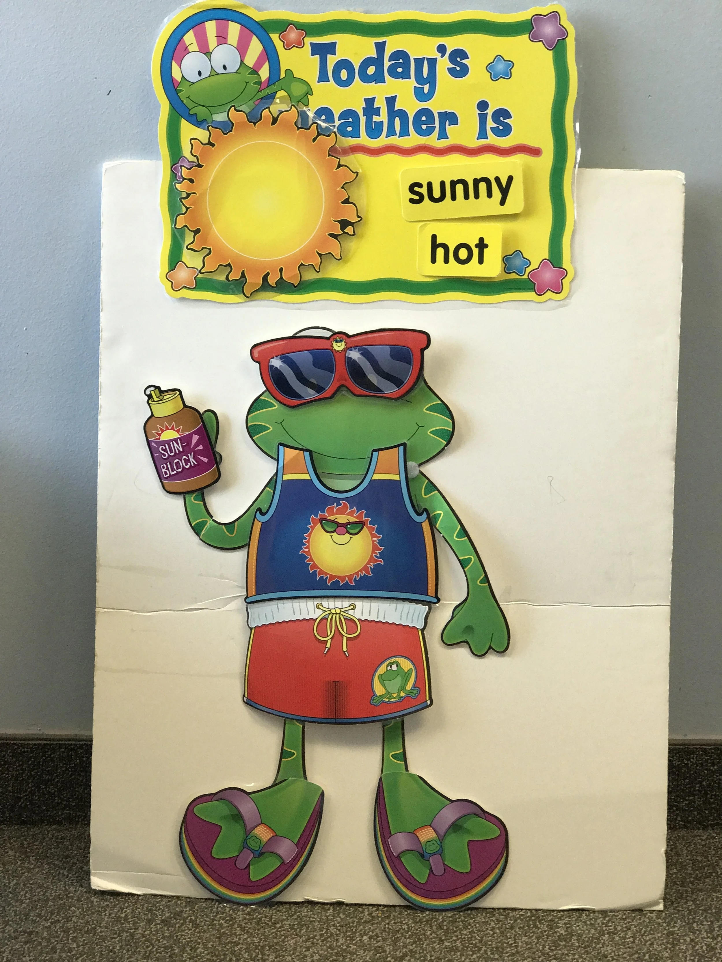 Each day we sing a “Weather Song” and talk about the weather (is it hot, cold, rainy, snowy, etc.). Then we dress our weather frog or weather bear while focusing on language such as, “shoes on feet,” “hat on head.” etc. We point to the visuals and model the language for our kids. After a short while, they begin to initiate and respond where to put the clothes on the bear.