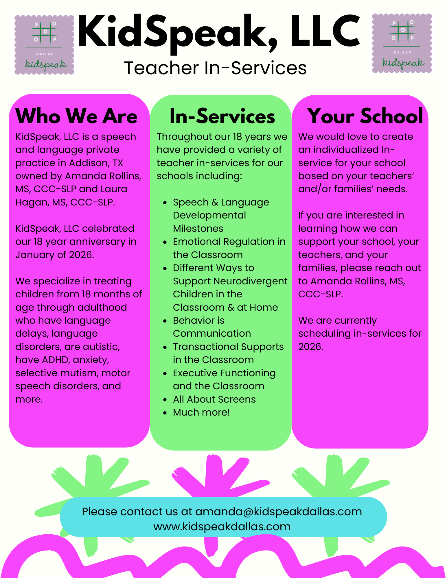 If you are interested in hosting a Teacher In-Service please contact Amanda Rollins at amanda@kidspeakdallas.com